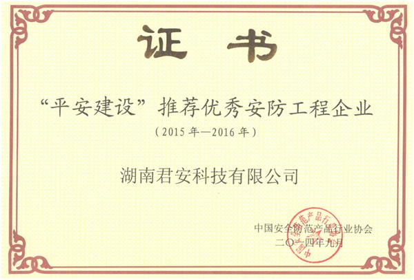 中國安全防范產(chǎn)品行業(yè)協(xié)會頒發(fā)的“平安建設(shè)”推薦優(yōu)秀安防工程企業(yè)
