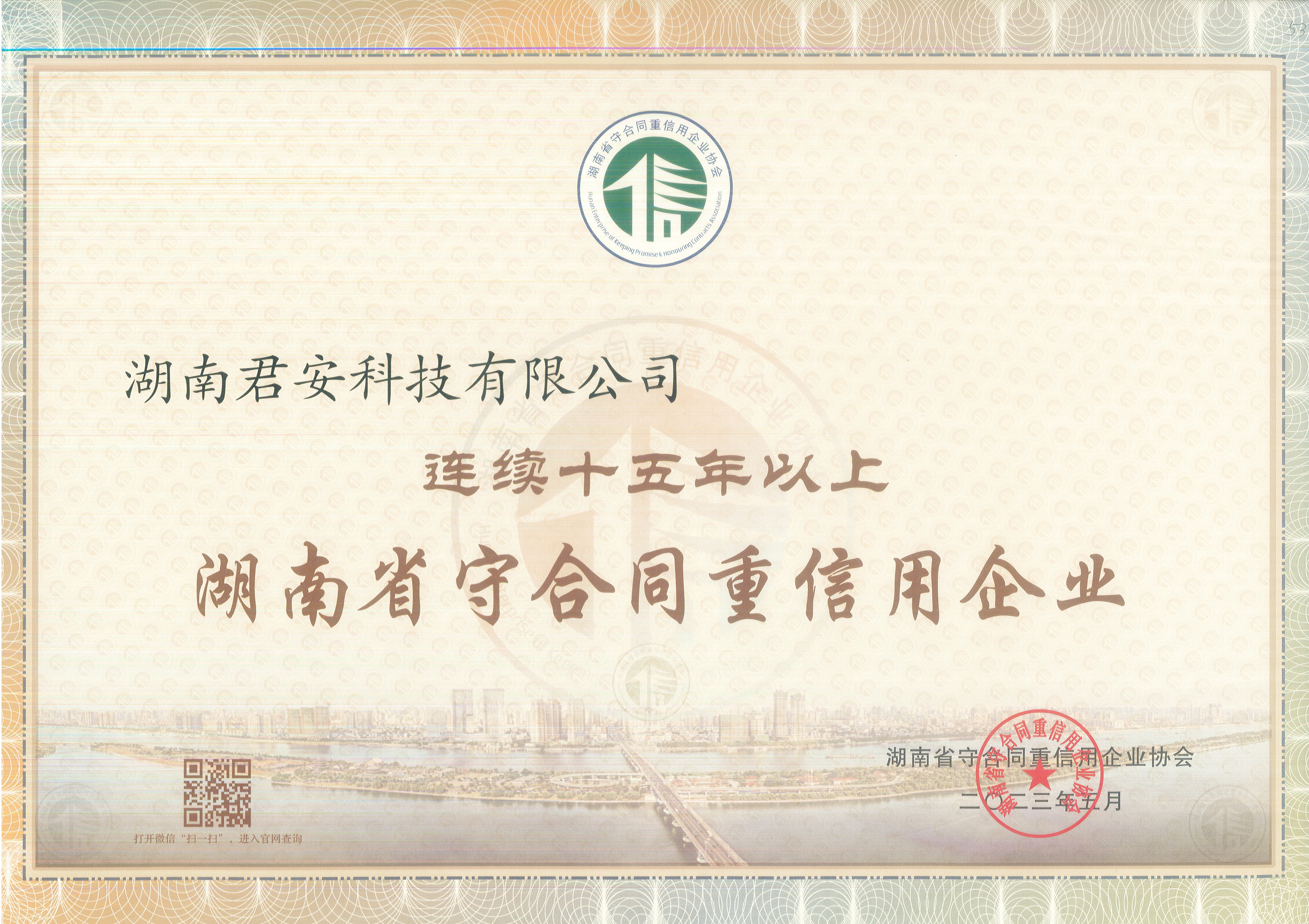 簡訊:君安科技連續(xù)十五年榮獲湖南省、長沙市“守合同、重信用企業(yè)”榮譽(yù)