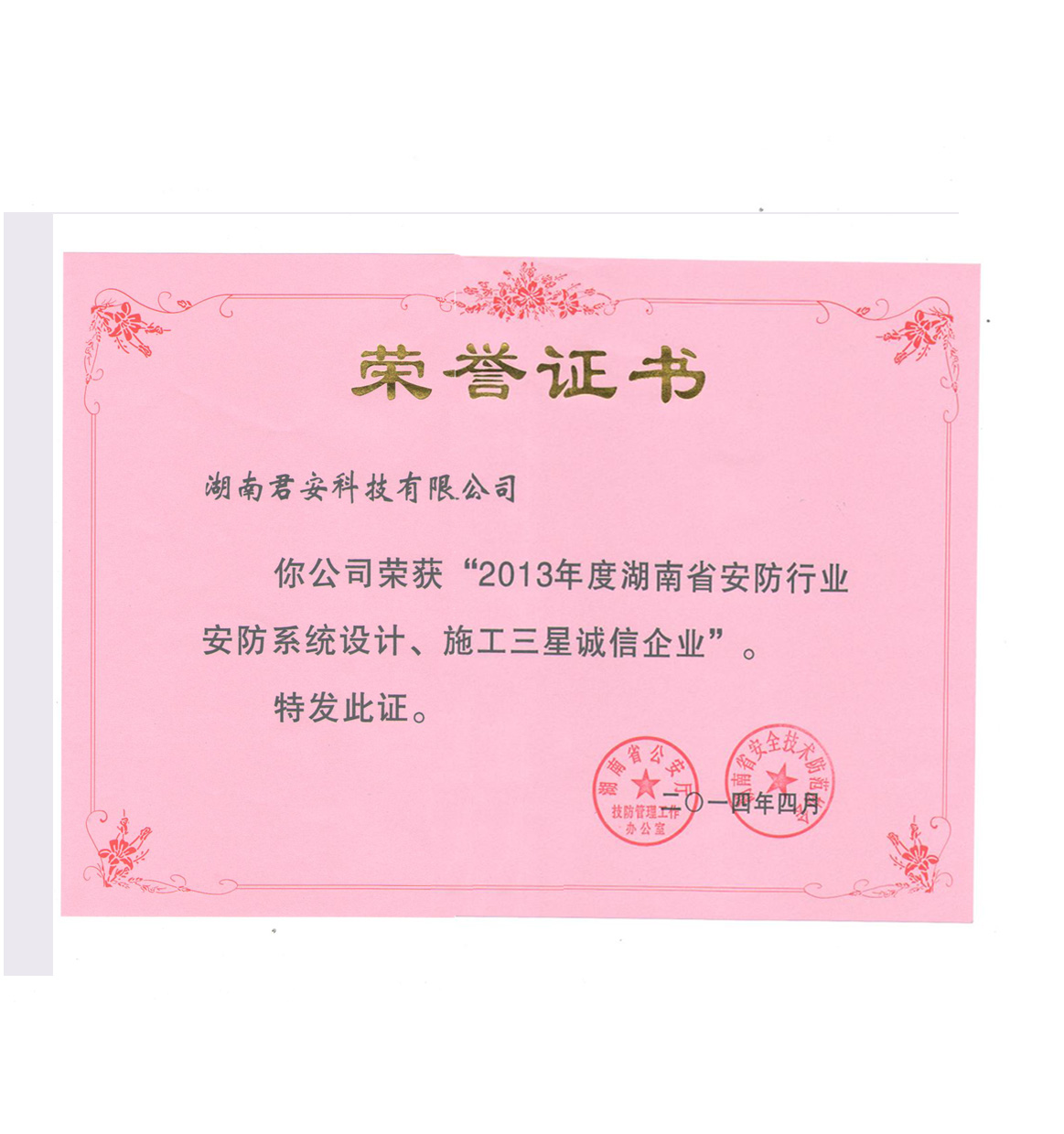 在同期舉辦的《湖南安防行業(yè)誠信企業(yè)授牌大會》活動中,由湖南省公安廳科技處、湖南省安全技術(shù)防范協(xié)會及湖南省公安廳技防管理工作辦公室等專家團(tuán),結(jié)合公開網(wǎng)上推薦等方式的綜合評定,湖南君安科技有限公司榮獲“湖南省安全技術(shù)防范設(shè)計施工三星誠信企業(yè)”稱號。