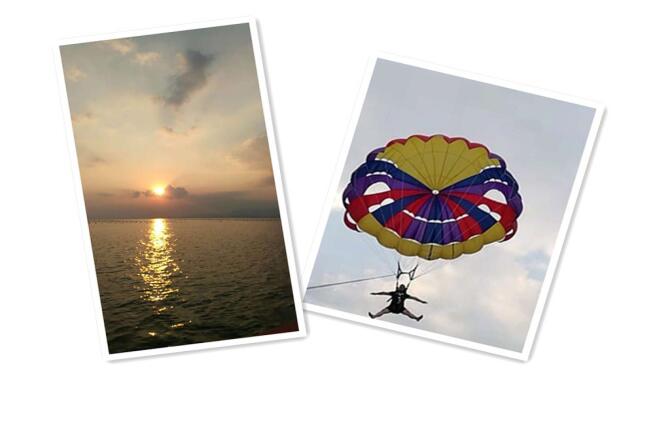 坐著拖傘,在海上飛翔,風(fēng)景可真美啊!海上的落日也是一番風(fēng)景哦!
